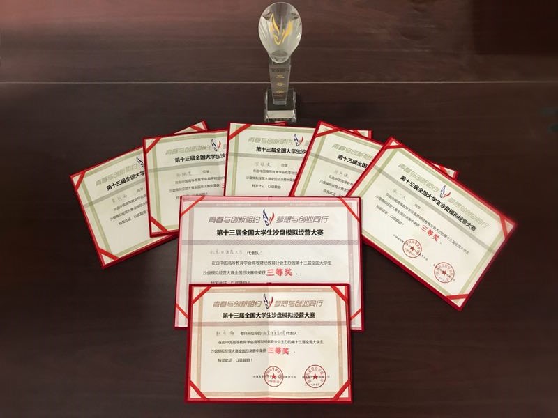 本次北中医代表队由耿冬梅老师带队,成员均来自356体育在线官网,包括队长黄烈雨,队员张佩文、邱庆疆、徐维波、张一夫。今年是365best体育亚洲官网第一次参加此类大型ERP企业沙盘模拟经营比赛,在学院领导的大力支持下,指导老师带领队伍成员在前期首先完成了基础知识的熟悉理解与大量的模拟练习,然后针对北京区总决赛进行了充足的准备,包括熟悉各类比赛平台、研读分析比赛规则与情报,在指导老师与五位同学的共同努力下,以北京总决赛一等奖的优异成绩获得了晋级全国总决赛的资格。全国总决赛的准备过程中,356体育在线官网的老师团结一心,为我校参赛队伍提供了各种帮助,参赛队伍在确定大致方略的同时,提前一天到达赛场,根据临场信息,连夜商讨本次比赛采用的具体战术。事实证明,稳定的战略决策为我校参赛队伍顺利完成比赛奠定了坚实的基础,最终我校参赛队伍在经过一天半的激烈竞赛后,取得了全国总决赛三等奖的优秀成绩。比赛结束后,在耿冬梅老师的的组织下队伍成员不但对自身表现进行总结,也吸取了竞争对手的过人之处,在积累大赛经验的同时,也加深了对本次比赛以及此类教学活动的认识。