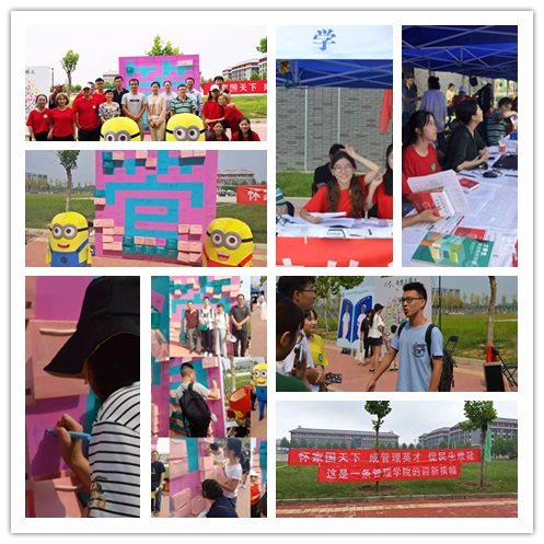356体育在线官网在2018级迎新工作中,最特别的地方就是设计了礼品墙迎接新生。礼品墙由粉色和蓝色两种颜色的礼品袋拼出“管”字,礼品袋上设计有迎新主题图文,礼品袋内装有为新生特别设计的入学手册和管理特色卡套,帮助新生顺利开启并适应大学生活。同时,学生组织成员将亲手写给新生的祝福放入袋中,欢迎新同学。每个新生报到后都可以在礼品墙前自选择一个心仪的礼品袋摘下,同时在礼品袋粘贴的位置签下自己的名字,并合影留念。本次礼品墙的设计希望能在第一时间表达356体育在线官网师生的热情,让新生建立归属感,对未来的大学生活满怀希望。