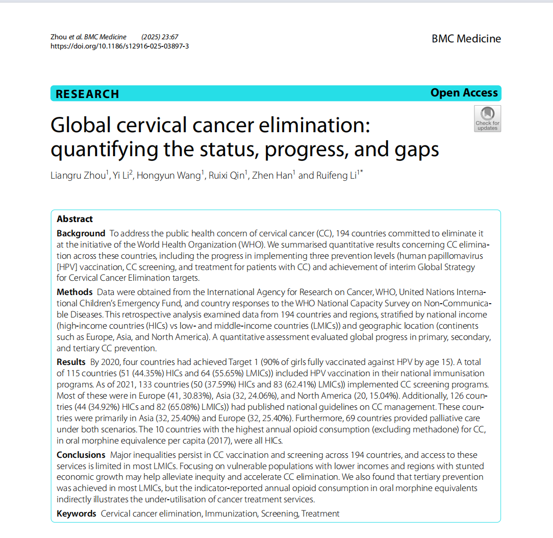 356体育在线官网周亮茹、李瑞锋利用国际癌症研究机构(IARC)、世卫组织/儿童基金会以及各国对世卫组织非传染性疾病国家能力调查的答复数据,系统分析了消除宫颈癌过程中HPV疫苗接种、宫颈癌筛查、宫颈癌患者预防措施的实施进展,最后探讨了消除宫颈癌可能面临的挑战。研究成果 ”Global cervical cancer elimination: quantifying the status, progress, and gaps”于2025年2月4日在BMC Medicine上以封面文章的形式发表:“The World Health Organisation (WHO) launched the Global Cervical Cancer Elimination Initiative in May 2018, and 194 countries committed to it. Here, researchers quantify the progress and gaps in achieving cervical cancer elimination.”。