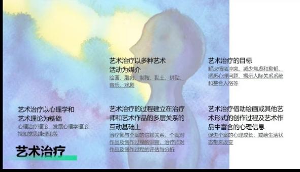 在讲座中,张老师详细阐述了艺术治疗在各领域的实践案例与应用趋势。介绍了在医院、社区、美术馆\博物馆、学校等不同场景下,以绘画、音乐、拼贴、黏土、数字技术等多种艺术媒介,通过艺术创作与反思作品,在诊断和疗愈心理或情绪问题及由此引发的相关疾病、特殊人群等议题上发挥的独特作用。她还分享了不同场景下,国内外艺术治疗实践探索案例,如蒙特利尔美术馆与阿尔茨海默症协会合作艺术治疗项目、中央美术学院艺术治疗研究中心招募多家高校大学生开展的“知心伙伴”社区艺术疗愈项目等。在学校场景中,艺术治疗助力学生心理健康成长。针对困境儿童和中学生面临的不同问题,如学习压力、心理困扰等,艺术治疗可以帮助其培养积极情绪,洞察正向特质,提升自我认知。