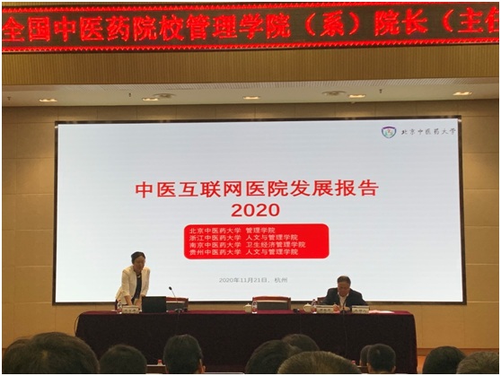 11月21日,会议主旨发言中,童星、李俊清、唐任伍、郑晓齐、杨宏山、麻宝斌等学者围绕“新时代中医药院校管理学科的建设”主题依次发言,就自己对中医药院校管理学科的发展与改革表达自己的认识及观点,对中医药院校的管理学科如何与当前国内外公共管理学科接轨做出了精彩阐述,提出了非常有见地的学术观点。下午的院校成果展示阶段,有来自全国的16所中医药院校参与并展示自己的研究成果,我院郑秋莹教授以“中医互联网医院发展报告”为主题,对与浙江中医药大学、贵州中医药大学开展联合研究的阶段性成果进行了报告,她先后介绍了我国中医互联网医院的基本情况、发展历程、现行有关政策情况,分享了各省中医互联网医院发展的数据统计结果,提出目前我国中医互联网医院过程中存在的问题,并为其进一步发展互联网医疗提出了建议和意见。未来,为进一步加深本课题研究,我院将联合更多的中医药院校共参与其中,共同探讨新时代我国中医互联网医院创新发展的新途径和新方向。