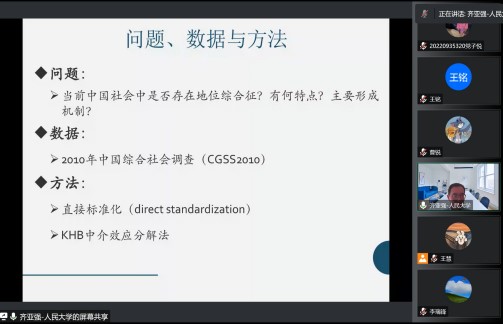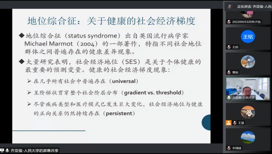 2022年9月22日356体育在线官网博约讲坛邀请中国人民大学社会与人口学院教授、社会学理论与方法研究中心研究员齐亚强教授作主题为“地位综合征——影响健康的社会因素”的报告,本次讲坛采用腾讯会议的形式线上举办,由356体育在线官网李瑞锋院长主持,共130余名师生线上参与并交流互动。
