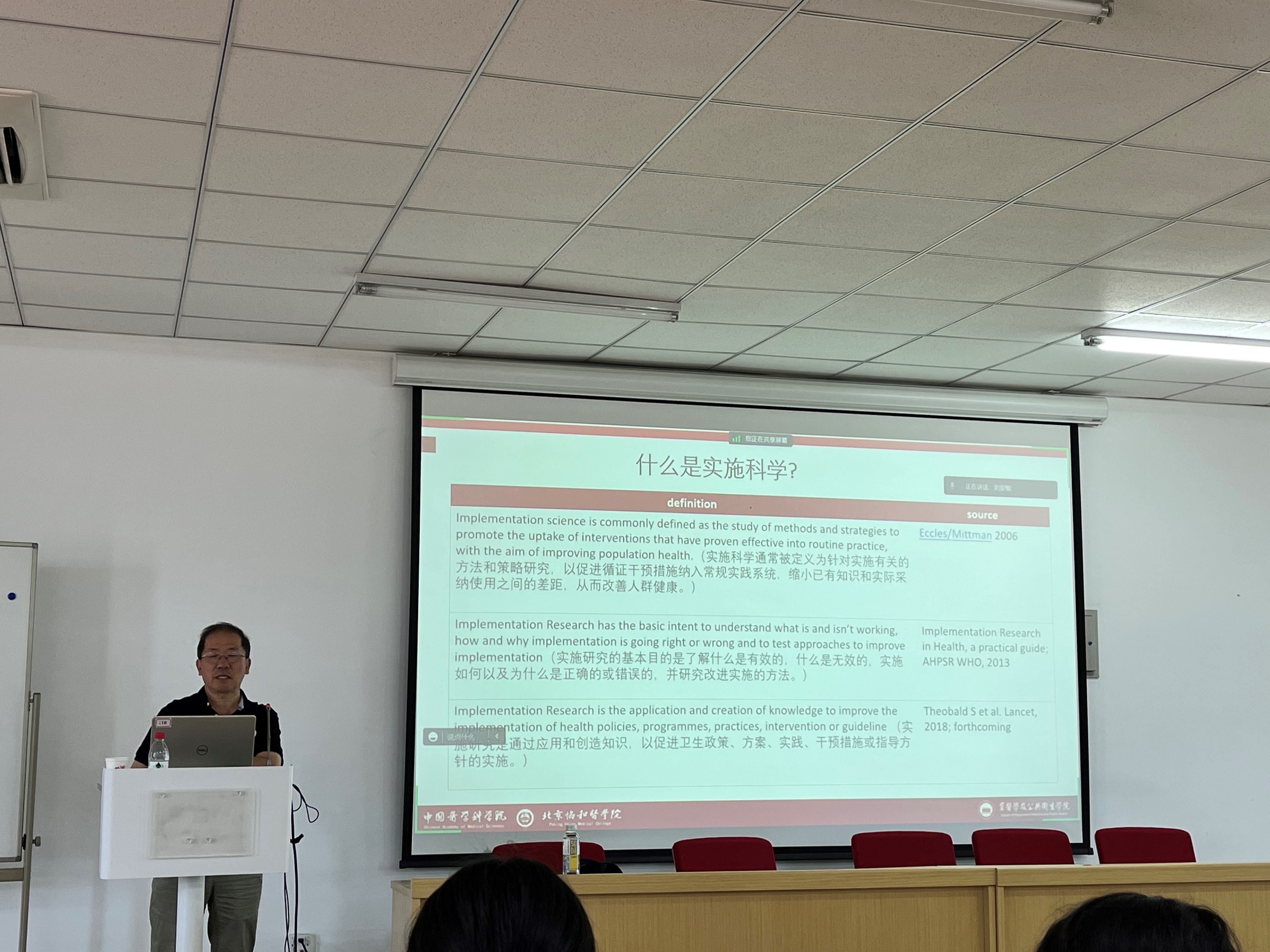 邵瑞太老师首先通过历史经验中探索败血症治疗方法的全过程向大家介绍实施科学的背景,自然的引出“什么是实施科学”这一提问,紧接着运用“如果北京到莫斯科之间电路出了问题,如何找到问题所在”这一案例,生动形象的向同学们娓娓阐述实施科学的内涵,并指出实施科学就是最佳路径选择。他强调,实施科学通常被定义为针对实施有关的方法和策略研究,以促进循证干预措施纳入常规实践系统,缩小已有知识和实际采纳使用之间的差距,从而改善人群健康。